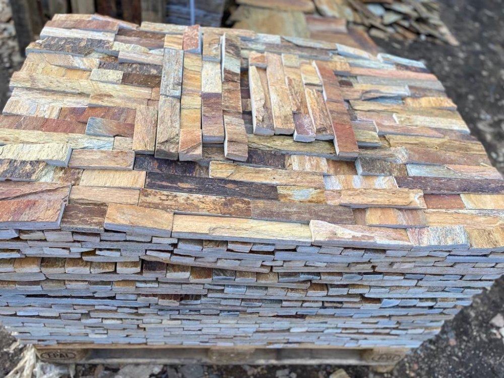 - плитняк пилёный на плитки- камень природной формы подвергается распиливанию диском с алмазным напылением в камнерезном цехе. Облицовка плиткой применяется, когда нужны чёткие формы на объекте, и природная форма не годится. Толщина плитки, используемой для облицовки составляет для разных видов камней от 1 см. до 4 см. Распиленный камень изготавливается нескольких видов, в зависимости от количества распилов: